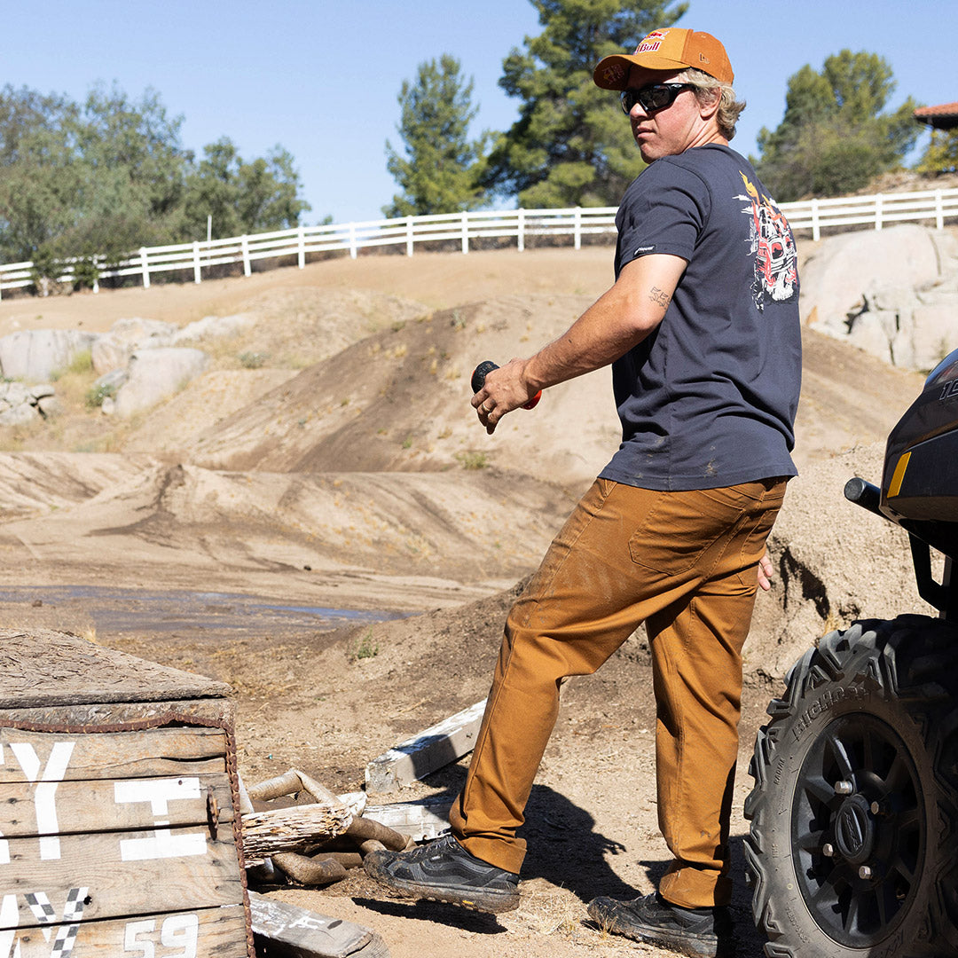 The Service Pant is built to handle whatever the day throws at you. Wrenching in the garage, hanging at the track, or grabbing a cold one after. Made from durable cotton canvas with a relaxed straight leg fit, it’s got all the right details. Hidden zip pocket, reinforced knife patch, key loop, and custom metal trims. Easy style, all day comfort, and always down to put in work.