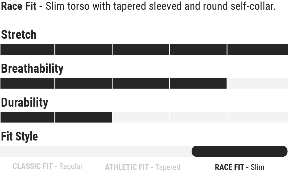 - Race fit, slim torso with tapered sleeves and round self-collar